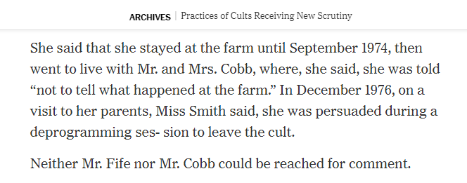Sam Fife’s successor, Buddy Cobb, took over the cult in 1980 and was the go-to person until his death. In 2017, Buddy Cobb was filmed by his granddaughter. She asked him more than once about the child abuse to which he stated that 1. nothing happens that is not the will of god and 2. children need to know evil to know good and to know what evil looks like.